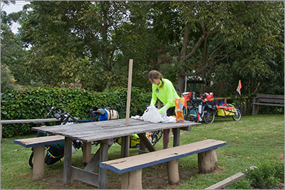 On our way into Forster we had our first incident. Denise drew up beside me after I had pulled off to the side of the road for a rest and then promptly fell off her bike. At the time she described it as “stopping suddenly”, either way the result was the same she was on the ground with her bike beside her. By evening her knee had swollen up so it was good that we had both refreshed our first aid certificates before we left. Not having any ice to bring down the swelling Denise watched the news with a cold orange on her knee.