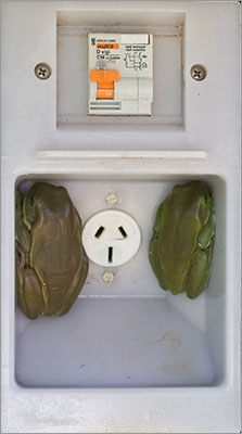 Frogs in the power box in the morning at The Gateway Village, Grafton, They were not there when we plugged in the previous evening.