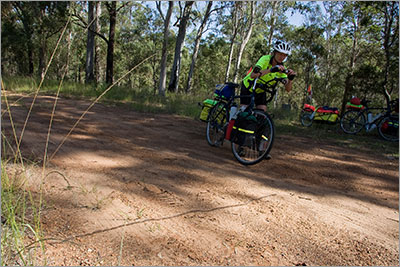 Towards Whiporie as we rode between the Bunyabba and Gibberagee State Forests magnificent trees provided us with welcome shade. We arrived at Whiporie about 3pm and set up camp while watching approaching rain clouds. Luckily they passed by. As the sun set the mossies came out and began to savage us so we quickly had dinner and retreated to the tent by 7pm. I think we were asleep by 8pm!