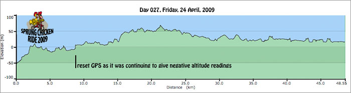 As we were talking to Eric, Mark noticed that the altimeter on the GPS was giving negative readings, (-16m near the top of a hill). After a couple more km of such readings we made a quick stop to turn the GPS off and on again. With positive altitude readings we headed off again but we will need to talk to someone about the irregular readings we have been getting.