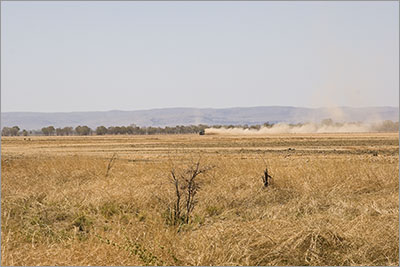 About 15 – 20 km along the Great Northern Highway we came across some very big dust clouds. This turned out to be a new irrigation ‘field’ being prepared as part of the Kingston Rest Tropical Forestry Services’ new Sandalwood plantation. Whilst I was taking photos, one of the workers came over to see what I was up to and gave me a quick explanation of what was going on. Apparently in the early mornings when they are working before the wind comes up, the dust hangs over the fields like fog.