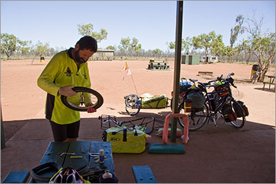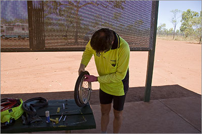Before morning teatime we stopped to examine the wheel on Mark’s trailer. It had been making a strange noise and when we had a look at it, it appeared to have a damaged tyre. The tube was still inflated so we decided to ride on to Nillbubbica Rest Area for morning tea and change the tyre in the shade of the picnic shelter.