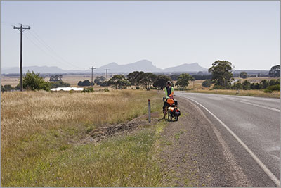 A mostly uphill ride today but for most of the day we had magnificent views of the southern Grampians, Mt Sturgeon and Mt Abrupt. Lots of big gum trees throughout the paddocks, so in a way very similar country to outside Penola.