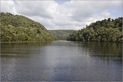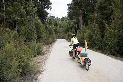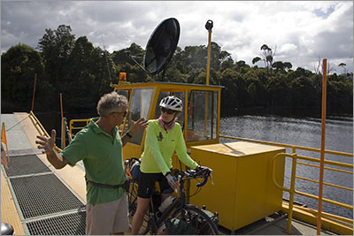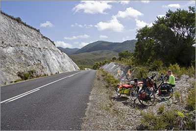 We started the day with a ride on the “Fatman” barge across the Pieman River. Then began what was the steepest climb we have come across on our journey around Australia. The first 12km of the road from Corinna to Zeehan is gravel with four steep sections that have been sealed to stop the road from being washed away. The barge operator told us that for the first four kilometres the road climbs steeply away from the river and then it is up and down until the end of the gravel. He was right. In the first 2km we climbed 200m and by the time we had covered the first 4km our average speed was only 5.6kph. The first sealed section turned out to be unrideable and we had a steep push uphill with cleats slipping on the bitumen. The gradient of this first piece of sealed road was so steep we doubt an unladen bike could be riden without tipping backwards. Needless to say we were glad when we reached the end of the gravel road.