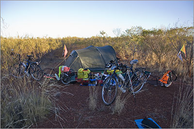 We were making good time today and by the time we stopped for lunch at 12.45 we had completed 70km, so we decided to keep riding until at least 4.00pm before we would start looking for a campsite. This brought us to the 41 Mile Bore Rest Area which is a large dusty ‘carpark’ used by caravans to stop for the night. Not our idea of a good place to stay, so we rode on. We finally decided to make camp 65 km from Threeways but not before discussing the option of riding all the way to Threeways. The traffic on the road was very light and I felt we could probably make it with about an hour of night riding which we felt would be safe to undertake. Denise was getting hungry so not wanting to risk a crotchety hungry companion for the next 65km I decided it was prudent to make camp for the night. However, it was nice to feel capable of being able to ride the entire 190 km in a single day – we must be getting fitter!