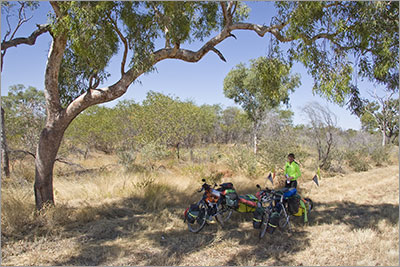 Last night we discovered that the Renner Springs Roadhouse bakes its own bread each day so we timed our departure this morning to correspond with the first loaf coming out of the oven. The opportunity of a lunch on the side of the road, under a tree, in the middle of nowhere with fresh crusty unsliced bread, salmon, tomato and cheese was too much to pass up. Another lunch on the road without vita-weet biscuits – hooray. (As you may have guessed, Mark is not keen on Vita Weets! – D)
