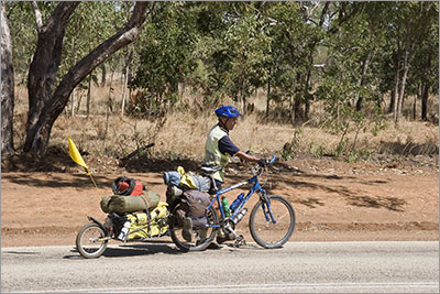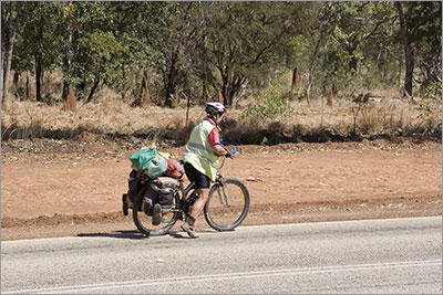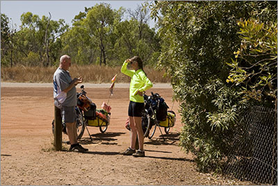 At the Larrimah Hotel we met a Japanese cyclist who we had heard about along the road. Dressed in all black he was known by the caravans as the Black Cyclist and had a reputation for asking for help along the way. When we arrived he had just finished swapping his tyres over and in very broken English asked if we had a spare tyre he could have. The tyre on the front of his bike was worn all the way around its circumference to the canvas. Our spare was the wrong size so we could not help. At the same time we also thought we should not need to help him believing he should not have ridden south of Katherine on such a tyre. We tried to suggest he should get a replacement before heading south but he disagreed. We saw him ride out of Larrimah the next morning and we would not be surprised to hear that someone has since rescued him somewhere between Larrimah and Tennant Creek.