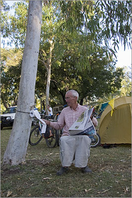 Peter and Barbara carry a toilet seat stool. However, we did not expect to find Peter trying it out in the middle of the campground!