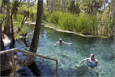 The Springs are hard to describe. Surrounded by pandanus, paperbark and palm trees the water flows along a creek with a couple of sizable water holes before we suspect it enters the Roper River. The water is a constant 34 degrees Celsius extremely clear with a blue hue to it. From above you can clearly see the bottom and all the fallen tree trunks and roots that crisscross the creek. The water on the creek’s edge is covered by a mat of green water plants and flowering water lilies. St Andrews spiders stretch their webs between the trees and the trees are alive with birds. But its true magic lies beneath the surface.