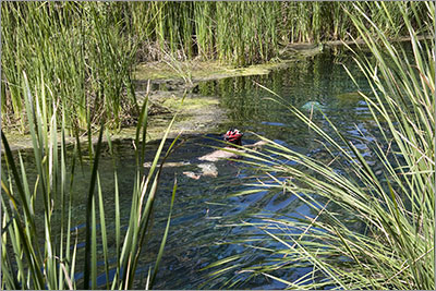 Just before lunch the four of us rode down to Bitter Springs. I was keen to try out our “handle bar cam” video camera under water as the day before we had seen fish hiding amongst weed along the bank. The camera’s specifications say it is safe to use the camera in the water but to date we had not tried it out under water.