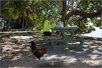 We had lunch on the beach at Cardwell and were joined by two roosters and a hen from the house across the road. We tried to coax them close to the bikes for some Sprung Chicken photos but did not have much success.