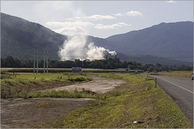 Smoke from the Tully Sugar Mill drifts through the main street of Tully.