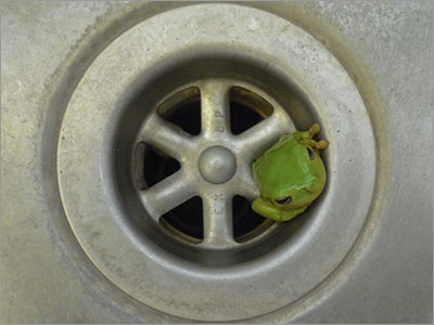 Getting stuck in a laundry tub - the hazard of being a green frog. Croydon Caravan Park.