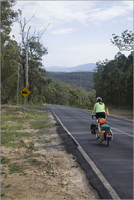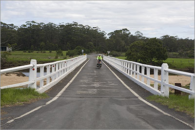 As we left Eden yesterday we had a very steep hill to contend with and the same was the case this morning on our ride out of Merimbula. However, neither of these two climbs have anything on the climb from the Murrah River halfway between Tathra and Bermagui. Other than the road out of Corinna on Tasmania’s west coast this is the first hill that Denise has found she could not ride up. As we both began to climb this hill we found ourselves zig zagging to keep our balance and our speed quickly fell below 5kph. It became a real effort to maintain our balance and keep turning the pedals and as we got further up the hill our cadence became slower and slower. Finally a voice called from behind me “Sorry, I am going to have to stop” and this came from the person who usually rides past me as I take a breather. I am still unclear on why Denise was sorry.
