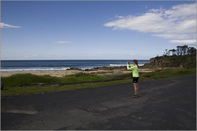 Denise taking photo, Cuttagee Beach, Tathra - Bermagui Road
