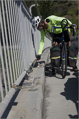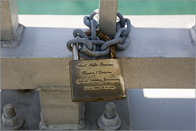 Denise reads some of the "bonds of love" engraved on padlocks attached to the Sea Cliff Bridge.