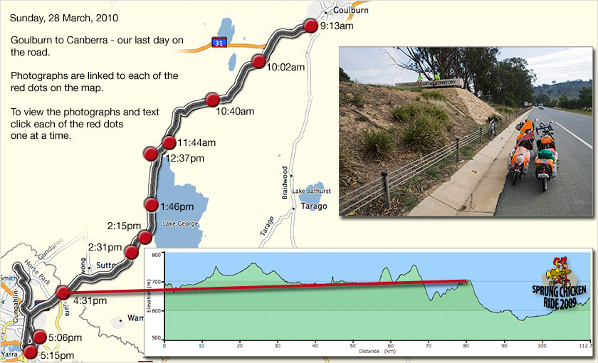 Today as we prepared to leave Goulburn there was no such hesitation about covering the distance. Rather we were concerned about covering the distance too quickly. As well as not wanting our journey to come to an end we had arranged to meet friends at Eagle Hawk at 4.00pm so they could ride with us into Canberra. As we left Goulburn at 9.00am we worked out we could be at Eagle Hawk at 1.00pm without too much effort, so we undertook to stop at anything that drew our interest along the way. Looking back over the last 12 months one of the most positive outcomes has been the building of our self-confidence. Having built a house ourselves, dragged up two children, started and run a successful business and now ridden a bicycle around Australia, we will definitely be looking for something else to challenge ourselves in the future.