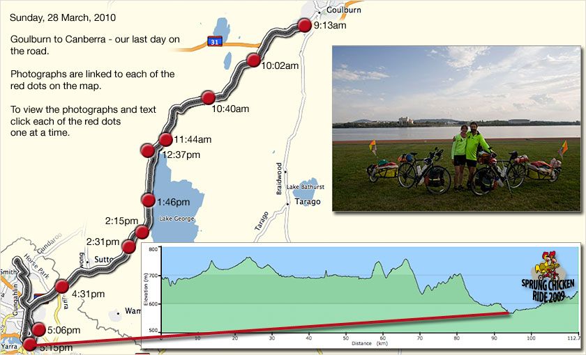 Today as we prepared to leave Goulburn there was no such hesitation about covering the distance. Rather we were concerned about covering the distance too quickly. As well as not wanting our journey to come to an end we had arranged to meet friends at Eagle Hawk at 4.00pm so they could ride with us into Canberra. As we left Goulburn at 9.00am we worked out we could be at Eagle Hawk at 1.00pm without too much effort, so we undertook to stop at anything that drew our interest along the way. Looking back over the last 12 months one of the most positive outcomes has been the building of our self-confidence. Having built a house ourselves, dragged up two children, started and run a successful business and now ridden a bicycle around Australia, we will definitely be looking for something else to challenge ourselves in the future.