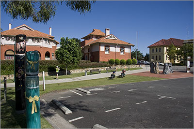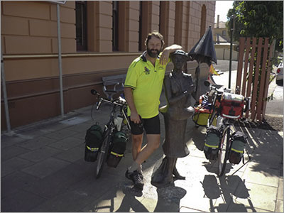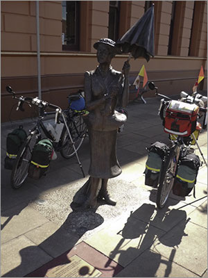 Bikes at rear of Customs House Residence, Portside, Maryborough. Bollards in foreground. They represent a sea captain welcoming a family of immigrants landing at the Port of Maryborough in the 1860s.