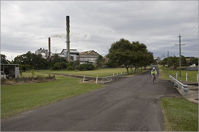 Sugar Mill next to Bundaberg Rum Bondstore. 5m rum bottle at end of road. Denise on bike.