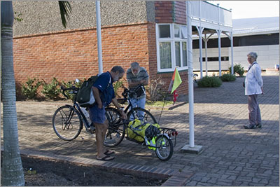 A funny thing happened on our way back to the caravan park. We stopped at a bicycle shop looking for a replacement mirror for Denise’s bike as one of the arms had split. Although we thought we had a spare with us we were not totally sure so we thought it best to try and buy another. Now I think you would agree that it is not normally easy for a car to park a bicycle into an open space so it is difficult to get the bike out again, but whilst I was in the shop the shop’s van returned and the driver squeezed itself within 5 cm of the front wheel of my parked bike. Ordinarily I would not have minded but I had a loaded trailer attached, which meant I had to pick the bicycle up and twist it out of the tight space. This is not an easy task with a single wheeled trailer. One would have thought the courteous thing would have been for the driver to ask Denise to move the bike before he drove in. The amusing thing is Denise had her helmet camera running and captured it all on tape. Anyway have a look at the video (with a few expletives removed).
