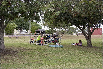 On our way out of Gladstone we passed the NRG Power Station and Rio Tinto’s Yarwun alumina refinery. The road was quite good so far. Twenty kilometres from Barney Beach we stopped at a roadside bay to allow Mark to take one of his ‘Out House Take’ photos. As we were about to leave, Bruce, the cyclist we met in Rosedale, pulled up. He had been to 1770 since we last saw him and coincidentally had stayed at the Barney Beach Caravan Park last night. We worked out that we must have only just missed each other at the exit gate. Bruce stayed with us until we reached Rockhampton.