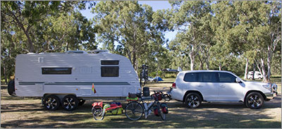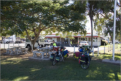 We stopped at Ilbilbie for lunch and because we had spent so much time talking this morning it was 2.30 by the time we started on the remaining 40km to Sarina. From Koumala we found the going a bit hard. The road surface was still reasonably good, but we seemed to have a head wind from time to time. We arrived at Sarina at 5pm and went to the Sarina Palms Caravan Village for the night.