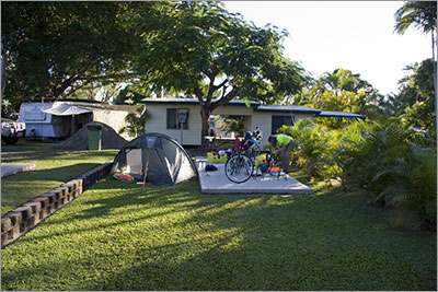 Sarina Plams Caravan Park. When we arrived last night the owner told us he "hated tents with a passion" as they damaged his grass. He required us to pitch the tent on a mix of grass and crusher dust, usually a spot where a caravan parks. Until now we didn't know our tent was wider than a caravan as it just fitted into the space. All that nice green grass and you cannot put a tent on it overnight!
