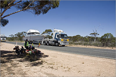 You see a lot of cars pulling tinnies as you drive around Australia but this fellow must have really liked his boat. Note the semi overtaking as we watch in the shade.
