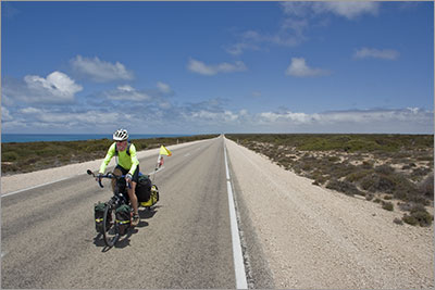 Since crossing the border the sealed shoulder that we have grown to expect in Western Australia has disappeared and the carriageway itself seems to be a lot narrower. We especially notice this when being passed by the road trains. The shoulder is very loose deep gravel so when a vehicle is approaching from behind and we think we should ‘bail out’ we have to exit onto the shoulder early and be stopped well before the vehicle passes. The only good thing about a vehicle passing us from behind is that the draft it creates gives us a little boost but if it comes too close we will get blown into the gravel. A fast late exit will undoubtedly hurt so we are constantly monitoring our mirrors to see what is happening behind. When a road train is approaching from the front our technique is to wave to the driver and then grab the handlebars securely, put our heads down and brace for the buffeting. Having said all this the road is not that busy and because it is very straight we have lots of time to decide what to do.