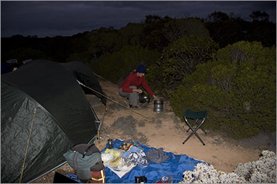 Denise cooking dinner and sheltering from the wind. Notice the beanie, it was an icy evening which was in complete contrast to the very high temperatures experienced here 2 weeks ago.