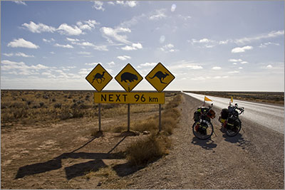 Looking back at one of the standard Nullarbor tourist photo opportunities. A warning sign for camels, wombats and kangaroos. All we had seen were lizards, dingoes and rabbits!