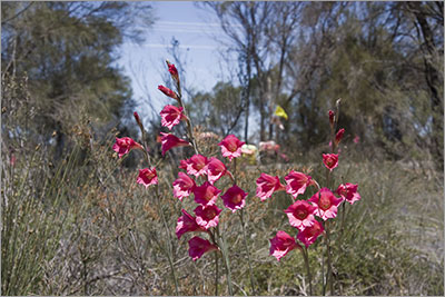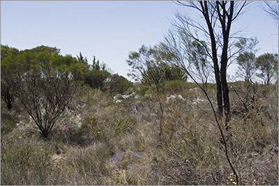 Along much of Dandaragan Road there were narrow strips of natural vegetation such as that on the left of the road. Within these patches of bush there is an abundance of flowers. In contrast on the other side of the road there is often very little diversity with either crops or improved pasture.