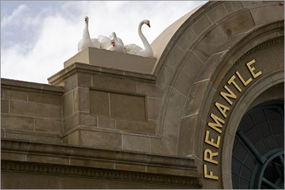 White swans on top of the Fremantle Railway Station. We thought WA had black swans!