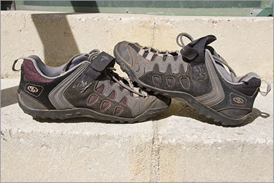 Mark's cycling shoes. Note the difference in colour. The right shoe (left) has faded whilst the left shoe (right) remains black. This has been caused by the sun which has been mostly on our right hand side since we left Cairns. Denise's shoes have faded in a similar fashion. Previously we reported how hot the sun was on our right hand side during the afternoon. These shoes show how harsh the sun has been.