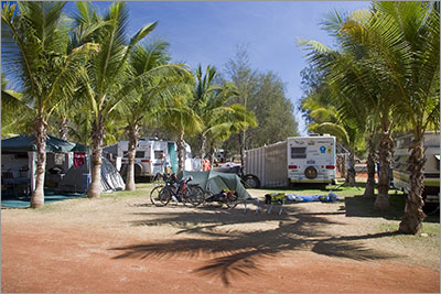 You cannot book to go to 80 Mile Beach you just turn up and they fit you in. If you want a powered site and one it not available when you arrive you just wait until the next day and move sites when someone leaves.