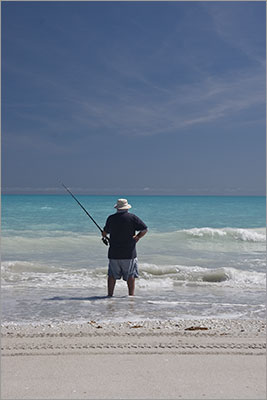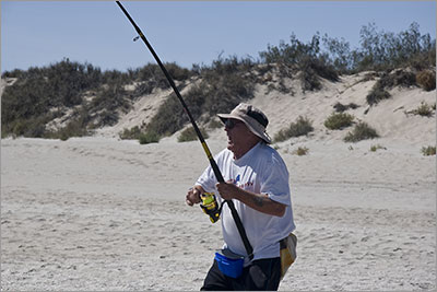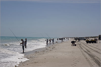 The view as we walked over the dune was most unexpected for as far as we could see there were people lined up along the shore fishing and when we say as far as we could see we mean as far as you could see and in both directions. We had never seen anything like it and as we walked behind them someone was always pulling in a fish.