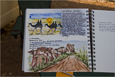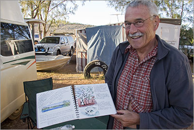 On the site across the road from ours we met Peter and Berti a retired couple from Switzerland. They were travelling south in a small Apollo campervan. Peter was working on a watercolour painting of the beach and Berti showed us Peter’s diary, which was a combination of small watercolour paintings and neat hand written notes about the places they had been. It was a very unique way of documenting a trip.